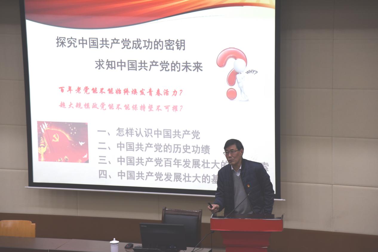 齐教授指出,要深刻认识开展“四史”学习教育的重大意义,进一步提振国民精气神,凝聚起同心共筑中国梦的磅礴力量。党史学习教育的核心是要增强对中国共产党的情感认同,随后他从“怎样认识中国共产党”、“中国共产党的历史功绩”、“中国共产党百年发展壮大的主要线索”以及“中国共产党发展壮大的基本经验”等四个方面作了深入阐述。齐教授强调,中国共产党历来注重以先进性打造政党品质和形象,坚持以人民为中心的群众路线,始终站在时代前列引领国家发展和社会进步,重视自身建设,从严管党治党,从而不断夺取中国特色社会主义新胜利,努力实现中华民族伟大复兴的中国梦。