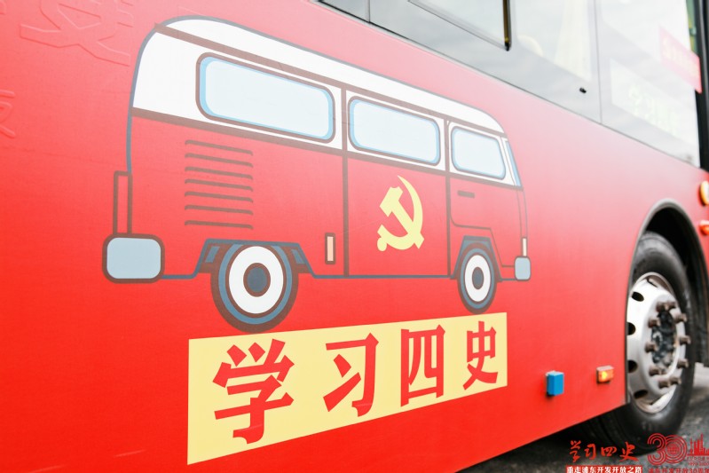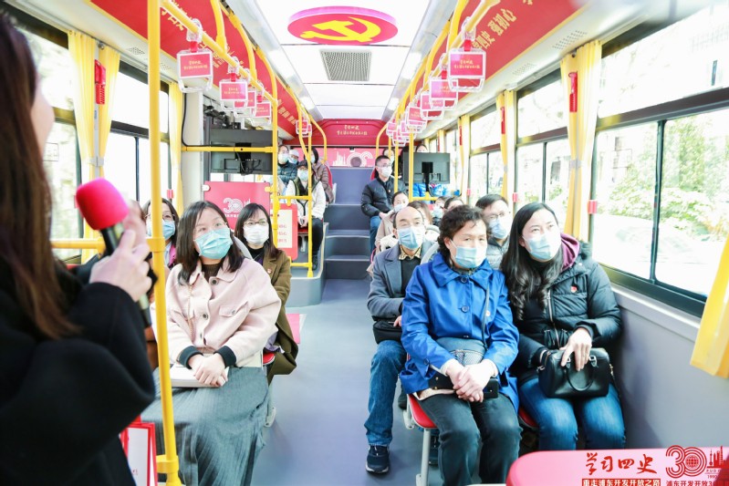“四史”巴士外观以炽烈的红色为主基调,车头及车身印有“浦东开发开放30周年”和“学习四史”标语,给人以奋进向上的视觉冲击。踏上红色巴士,车内布置成沉浸式体验课堂,随着巴士缓缓开动,党员们开始体验浦东开发开放30年来的历程。