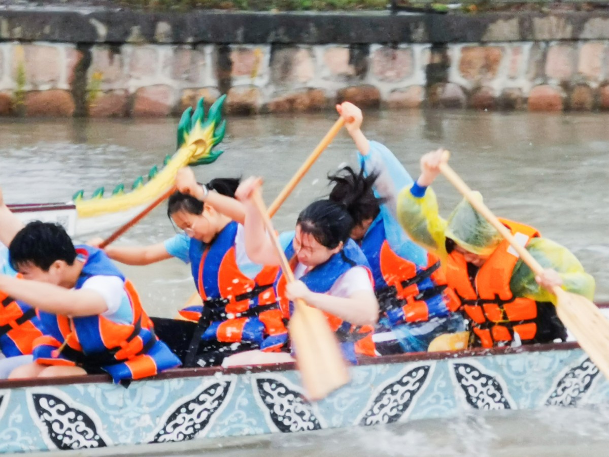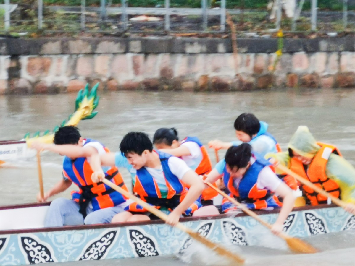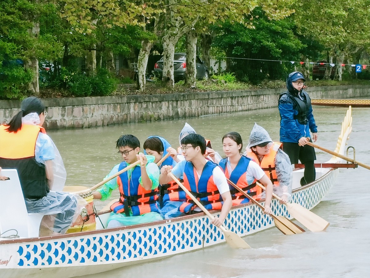 比赛之前,师生队员们利用午休时间,在老队员的带领下进行了磨合训练。李倩老师是第一次这样近距离接触龙舟,却毫不怯场,在队长的指导下迅速掌握了要领,很好的跟上了启动桨的快节奏。顾翠英老师是校教工龙舟队的队员,有丰富的比赛经历,和我们这些年轻人相比毫不逊色。