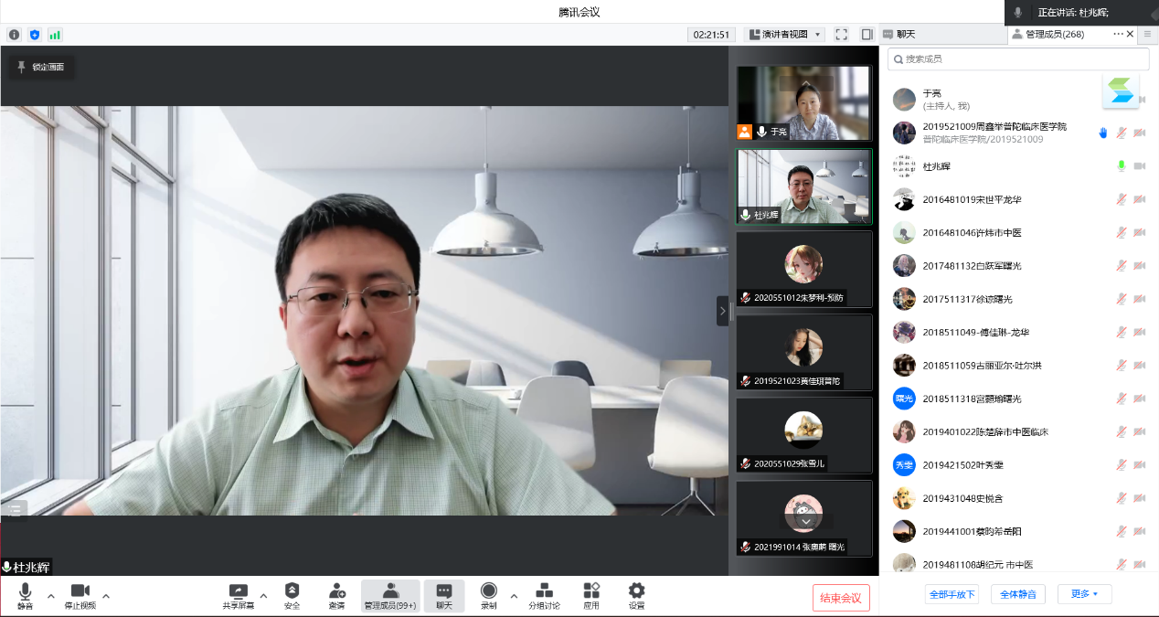 616日上午,公司全科医学系邀请公司附属上钢社区卫生服务中心主任杜兆辉为小学期实践的同学们做题为“社区卫生服务机构在疫情防控中的基础作用和实践思考”主题演讲。2019级中医学和中西医结合临床,2020级预防医学、食品卫生与营养学和公共事业管理专业以及相关老师近270人聆听讲座,讲座由太阳成集团tyc122cc副经理谢国群主持。