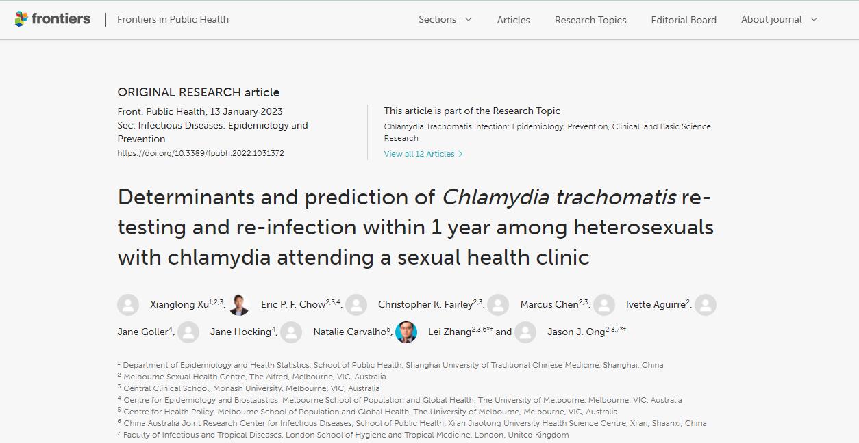 近日,公司徐祥龙特聘青年研究员和澳大利亚莫纳什大学Jason J. Ong, Lei Zhang, Christopher K. Fairley, Eric P.F. Chow等教授在Frontiers in Public Health期刊合作发表题为 “Determinants and prediction of Chlamydia trachomatis re-testing and re-infection within 1 year among heterosexuals with chlamydia attending a sexual health clinic” 的论文。该期刊主要聚焦于公共卫生领域的前沿研究。该期刊也是中国科协科学技术创新部发布的预防医学与卫生学高质量科技外文期刊,JCR分区为Q1,收录于SCI/SCIE中, 影响因子为6.461。