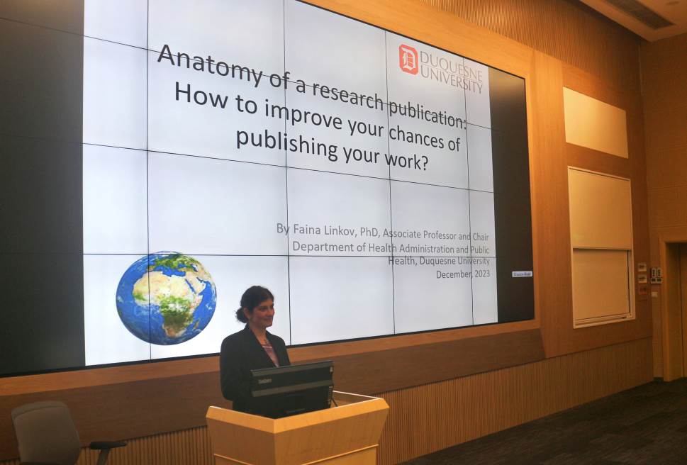 对于广大的科研工作者而言,如何提升自己论文成功发表的机会这一问题,不仅关系到个人的职业发展,也关系到学术影响力的提升和学术交流的促进等。12月12日下午,Faina Linkov副教授以“Anatomy of a research publication: How to improve your chances of publishing your work?”为题介绍了有关科学论文发表的经验。她从了解科员工产力以及它重要的原因、描述科学出版物的基本部分、讨论优化出版机会的方法以及未来的发展方向四个方面进行详细介绍。她分析了全球现存论文提交的问题、论文提交出版的流程、期刊的影响因子、个人的影响因子、实证研究的过程和方法论等。Faina Linkov副教授从分析一篇学术论文的基本构成:摘要、简单介绍、材料与运用的方法、结果与分析讨论和参考文献等为例,指出在撰写和编辑论文时,如果其中研究的方法与结果不一致,或者是文章的数据不准确,都很容易导致论文无法成功发表。