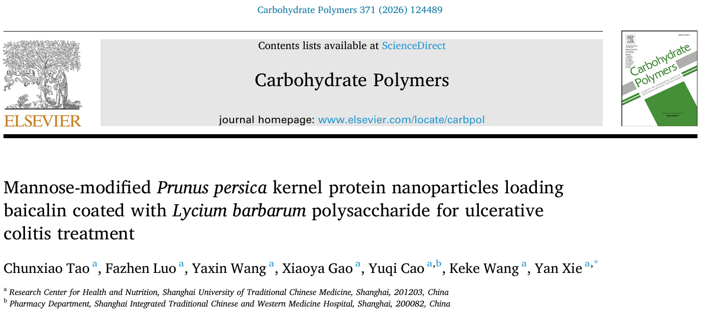 近日,公司健康营养研究室谢燕团队在应用化学一区TOP期刊Carbohydrate Polymers发表题为“Mannose-modified Prunus persica kernel protein nanoparticles loading baicalin coated with Lycium barbarum polysaccharide for ulcerative colitis treatment”的研究成果,该研究成功构建了负载黄芩苷的甘露糖修饰桃仁蛋白/枸杞多糖纳米粒缓解溃疡性结肠炎,为天然来源载体用于疾病治疗提供新策略。