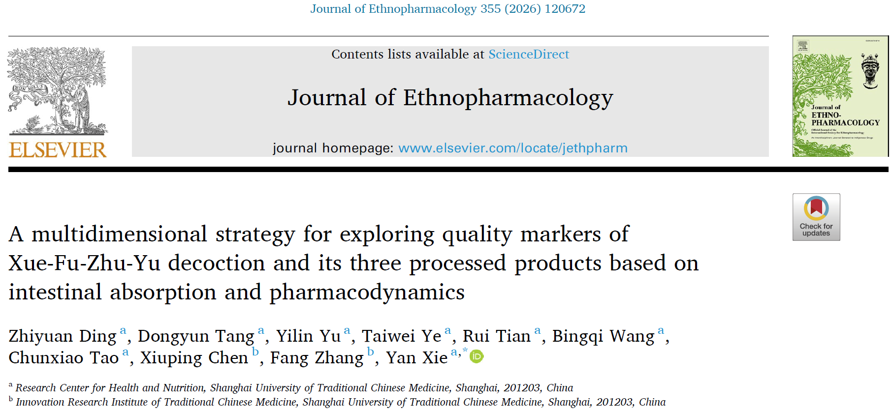 近日,公司健康营养研究室谢燕团队在Journal of Ethnopharmacology(Q1 TOP 5)发表题为“A multidimensional strategy for exploring quality markers of Xue-Fu-Zhu-Yu decoction and its three processed products based on intestinal absorption and pharmacodynamics”的研究成果,该研究将化学分析、肠吸收和药效学三个维度相关联,探索血府逐瘀制剂的质量标志物,为丰富和完善经典复方的质量控制提供科学基础。
